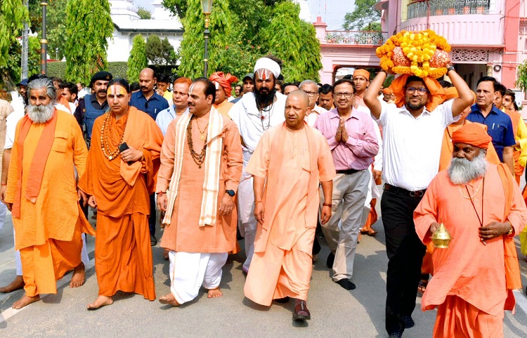 श्रीमद्भागवत महापुराण कथा शुभारंभ के अवसर पर गुरु गोरखनाथ मंदिर के गर्भगृह से भव्य शोभायात्रा निकाली गई। गर्भगृह में मुख्यमंत्री एवं गोरक्षपीठाधीश्वर योगी आदित्यनाथ ने विधि विधान से श्रीनाथ जी, अखंड ज्योति एवं पोथी (श्रीमद्भागवत महापुराण ग्रंथ) पूजन का अनुष्ठान संपन्न किया। तत्पश्चात शंख, घंट-घड़ियाल, तुरही, नागफनी आदि वाद्य यंत्रों की गूंज एवं बैंड बाजे के बीच शोभायात्रा कथा स्थल महंत दिग्विजयनाथ स्मृति भवन पहुंची। यहां वैदिक मंत्रोच्चार के बीच व्यासपीठ के समक्ष अखंड ज्योति व श्रीमद्भागवत महापुराण ग्रंथ को प्रतिष्ठित किया गया। मुख्यमंत्री, संतों व यजमानगण ने व्यासपीठ का पूजन व कथाव्यास का अभिनंदन किया।