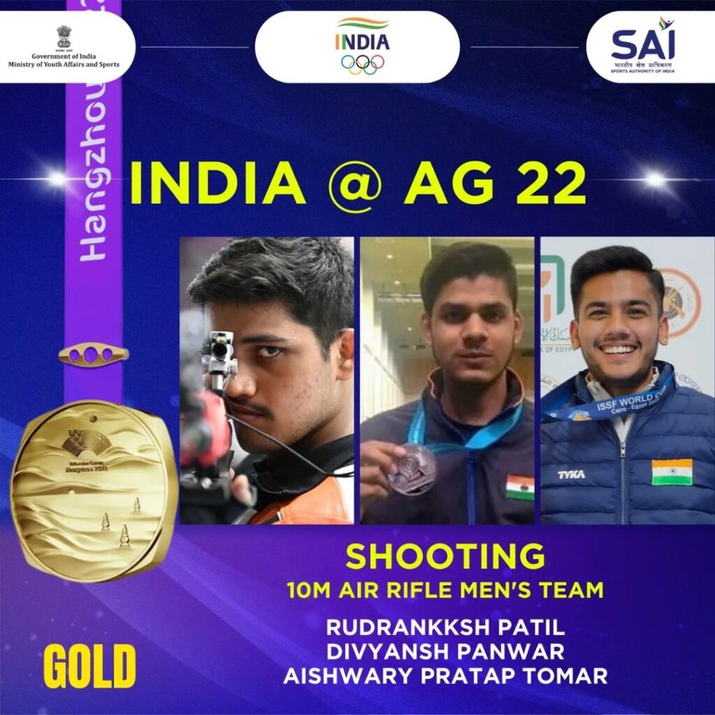 रुद्राक्ष पाटिल, ऐश्वर्य तोमर और दिव्यांश पंवार ने 10 मीटर एयर राइफल टीम स्पर्धा जीती। एशियाई खेल के इस संस्करण में भारत ने पहला स्वर्ण पदक अपने नाम किया।