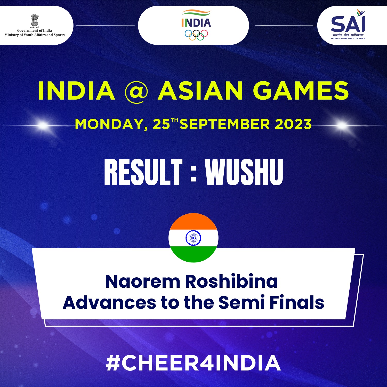 एशियाई खेल में भारतीय खिलाड़ी नाओरेम रोशिबिना देवी ने महिलाओं की 60 किलोग्राम वुशु (सांडा) स्पर्धा के सेमीफाइनल में पहुंच कर भारत के लिए एक और पदक पक्का कर लिया। रोशिबिना ने अंतिम चार में पहुंच कर कम से कम कांस्य पदक पक्का कर लिया।