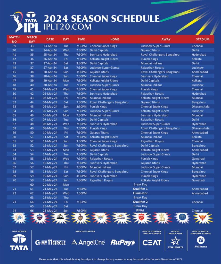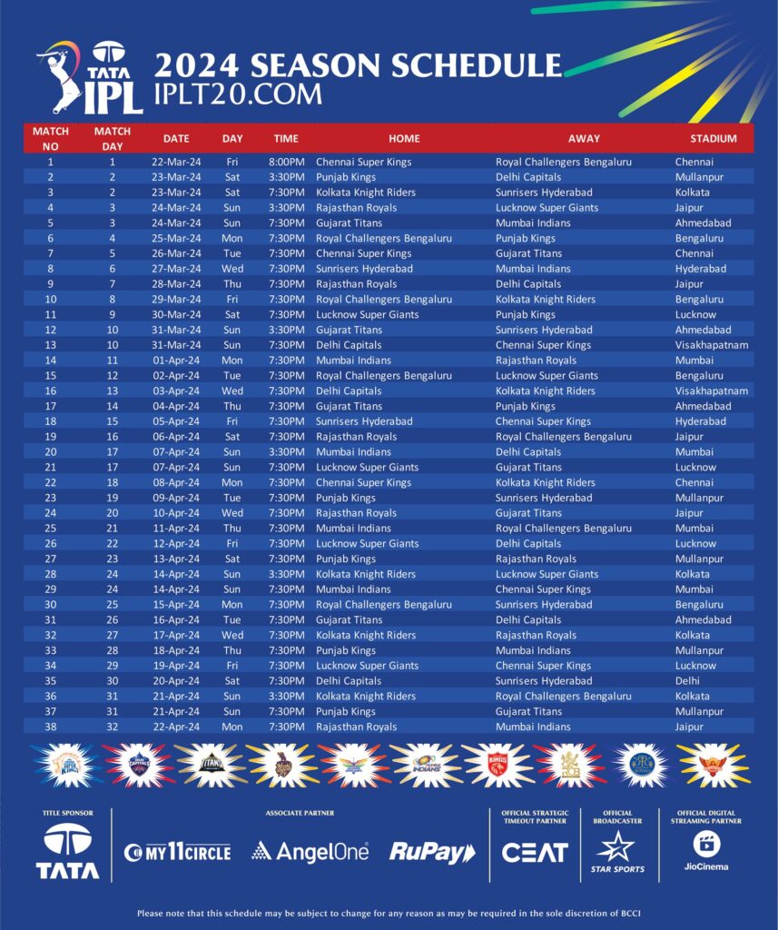 आईपीएल 2024 का पूरा शेड्यूल आया सामने, फाइनल 26 मई को