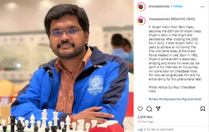 पी श्याम निखिल हाल में दुबई पुलिस मास्टर्स शतरंज टूर्नामेंट में तीसरा और अंतिम ग्रैंडमास्टर (जीएम) नॉर्म हासिल करके भारत के 85वें ग्रैंडमास्टर बने।