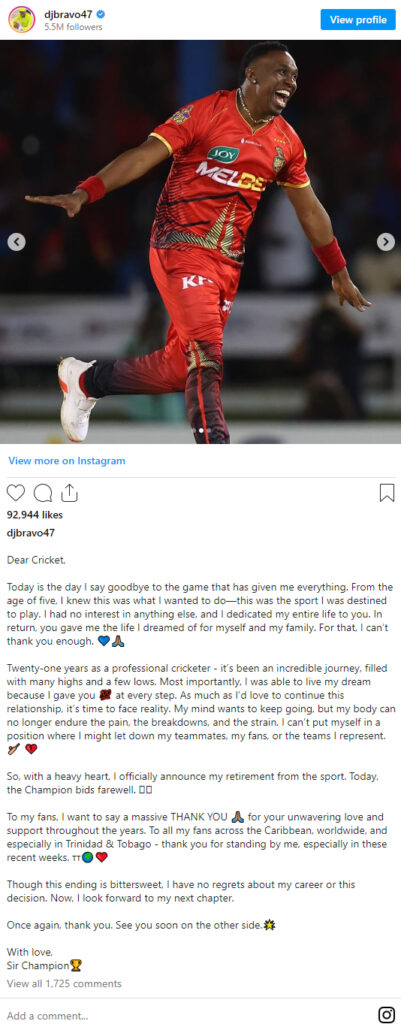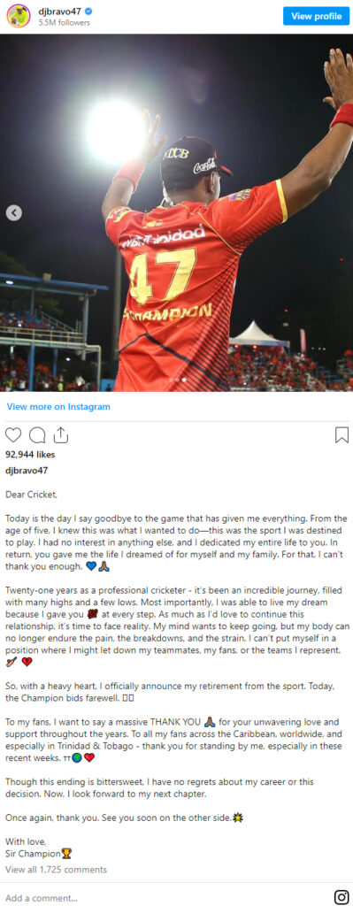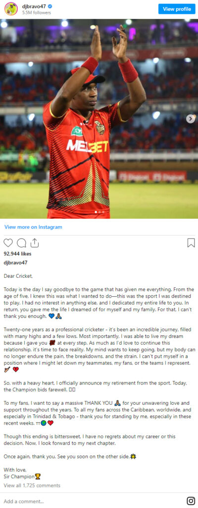 ब्रावो ने इंस्टाग्राम पोस्ट में लिखा, ‘पेशेवर क्रिकेटर के तौर पर 21 साल- यह एक अविश्वसनीय यात्रा रही है, जिसमें मैने कई उतार-चढ़ाव देखे हैं। सबसे महत्वपूर्ण बात यह है कि मैं अपने सपने को जी पाया क्योंकि मैंने हर कदम पर अपना 100 प्रतिशत देने का प्रयास किया।