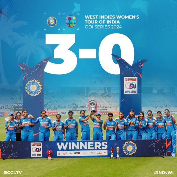 भारतीय महिला टीम ने तीसरे और आखिरी वनडे में वेस्टइंडीज महिला टीम को 5 विकेट से हराकर सीरीज पर 3-0 से कब्जा जमाया। वडोदरा के कोटाम्बी स्टेडियम में खेले गए मैच में वेस्टइंडीज की टीम पहले बल्लेबाजी करते हुए 38.5 ओवर में 162 रन पर ही ढेर हो गई।
